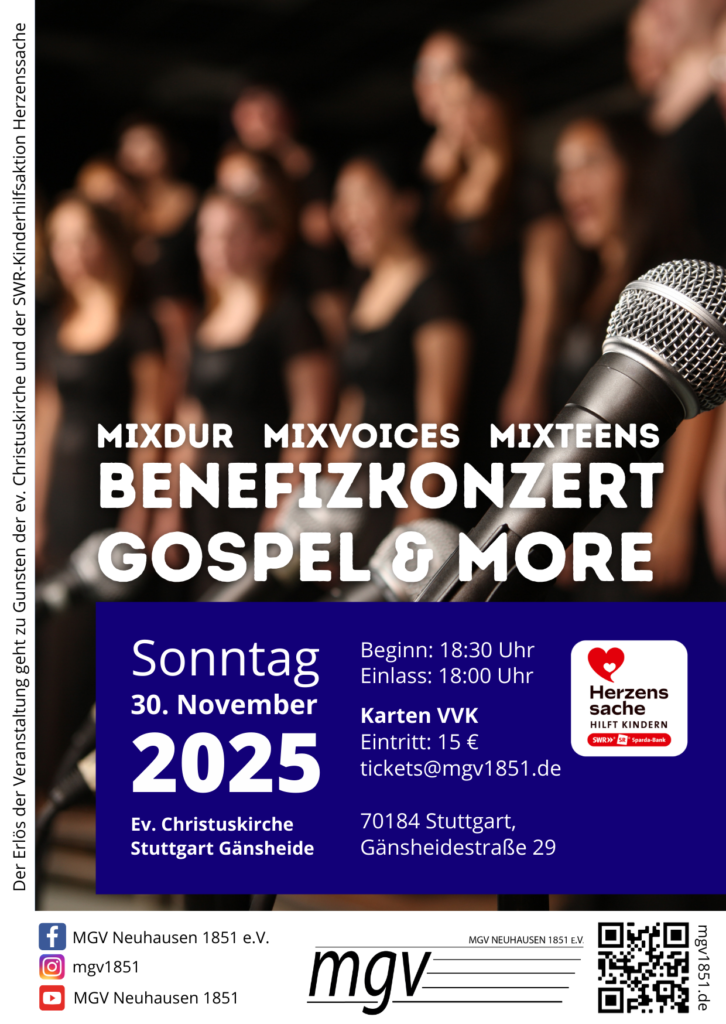 Am 30. November 2025 ist es soweit. Der moderne Chor MixDur vom MGV Neuhausen/Fildern gibt in der Evangelischen Christuskirche Stuttgart ein großes Benefizkonzert. Mit stimmungsvollem Programm und einer kleinen Begleitband werden die fast 100 Sänger*innen von MixDur ihre Gäste wieder musikalisch begeistern und ein stimmungsvolles Konzert präsentieren. Unterstützt werden Sie dabei von den Jugendchören MixTeens und MixVoices, dessen Sänger*innen mit ihren jungen und klaren Stimmen die Kirche mit Gospel, Pop-&Rocksongs sowie weihnachtlichen Liedern zum Schwingen bringen werden.