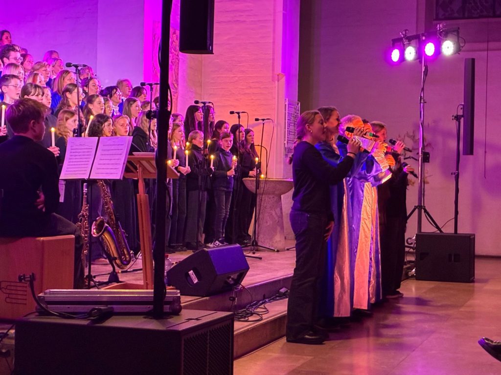 Einen stimmungsvollen Höhepunkt gestaltete Janina, die mit „Krieger des Lichts“ die Mix Teens/Mixed Voices zurück in den Altarraum führte. Mit kleinen Lichtern brachten die jungen Sänger-innen buchstäblich Helligkeit in die dunkle Kirche. Ein Moment voller Wärme und Glanz.