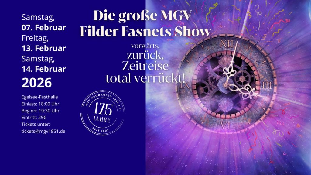 Die Zeit steht nicht still. Der MGV präsentiert eine Zeitreise voller Comedy, Tanz und Gesang. So wird die Show und so heißt auch das Motto der großen MGV-Filder-Fasnets-Show 2026 in Neuhausen.